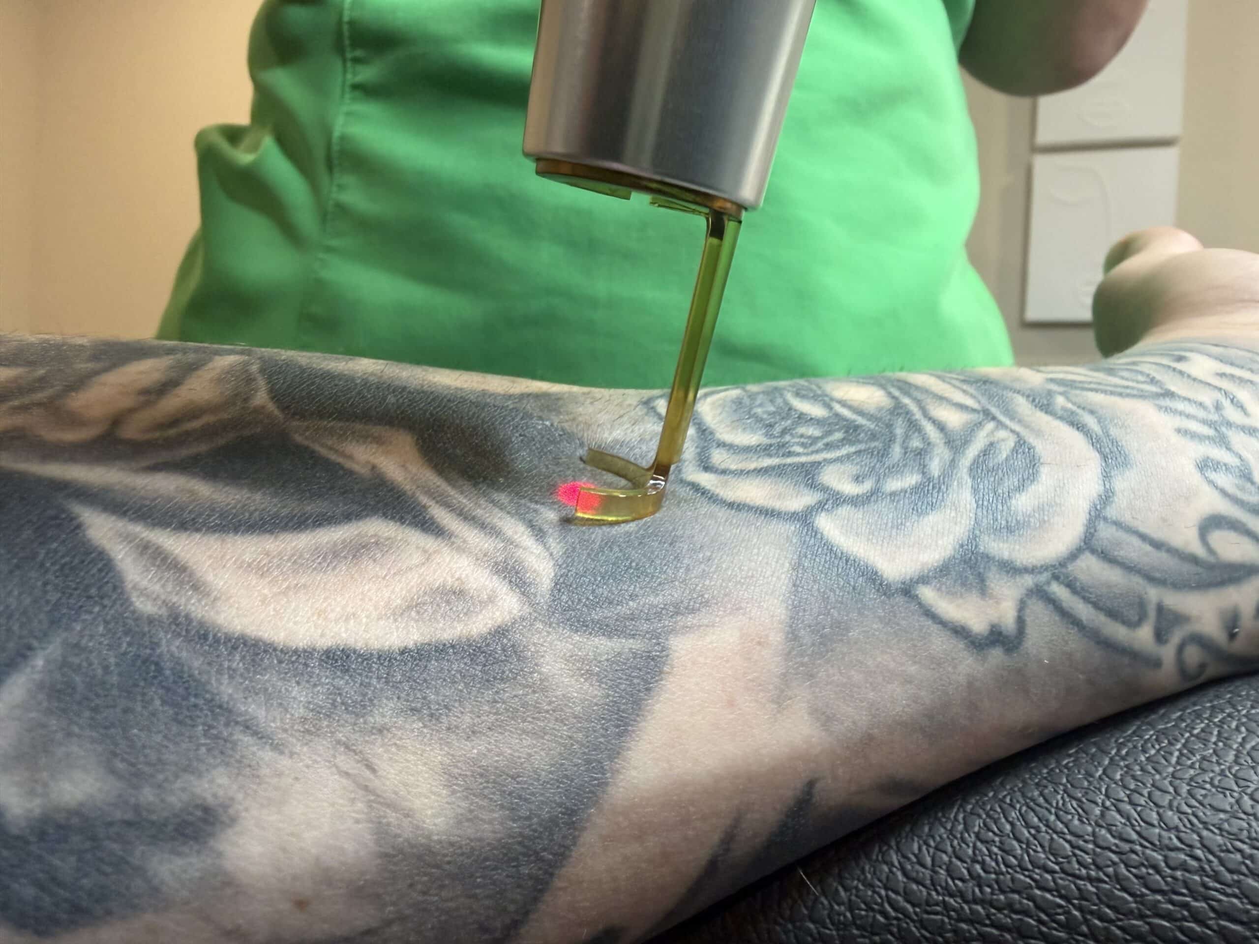 - Laser Treatment: The laser will deliver pulses of intense light through the outer layer of your skin, targeting the tattoo ink beneath.
